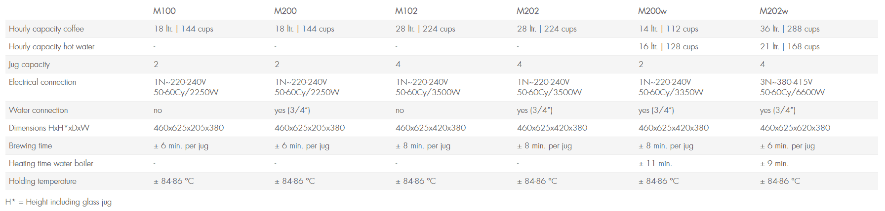 With M-line coffee makers you can easily and quickly brew fresh coffee directly into a glass jug. The brewing time is about 6 minutes for 15 cups (1 jug). The self-regulating hot plates ensure that the coffee is always at the correct temperature.